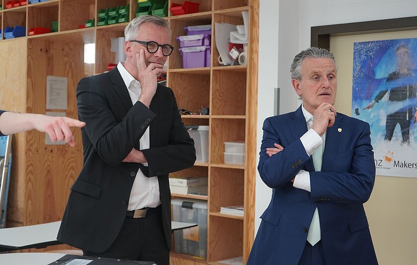 Michael Zieher, Direktor des Landesmedienzentrums (li) und OB Dr. Frank Nopper (re) zeigen sich interessiert an den neu gestalteten Lernräumen.
