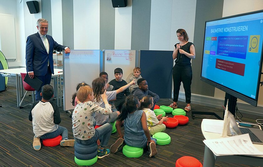 Dabei konnte er Grundschul-Kindern im Unterricht live beim Konstruieren von Türmen aus dem 3D-Drucker in einem innovativen Klassenzimmer über die Schulter schauen.