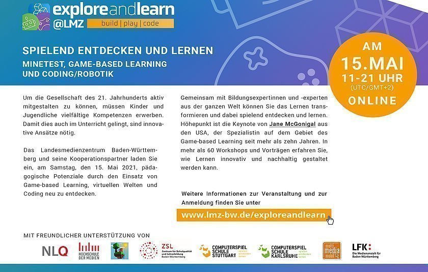 Das Landesmedienzentrum Baden-Württemberg und seine Kooperationspartner laden Sie daher ein, am Samstag, den 15. Mai 2021, pädagogische Potenziale durch den Einsatz von Game-based Learning, virtuellen Welten und Coding neu zu entdecken. Vertreten ist die ComputerSpielSchule des Stadtmedienzentrums Stuttgart!